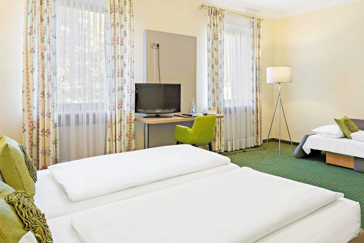 Moderne Business – Komfort Dreibettzimmer mit 23 m², Doppelbett, Schreib-/Arbeitstisch,  kleiner Tisch mit  Couch, Badezimmer mit , Dusche  WC, Waschtisch, Kosmetikspiegel, Föhn, Telefon, teilweise LED-Bett-Beleuchtung Sat-TV, kostenloses WLAN. Die Zimmer liegen zur Straßenseite und bieten den idealen Rahmen für einen angenehmen Aufenthalt für 3 Personen. Die Bilder dienen als Beispiel, die Möblierung oder der Grundriss können variieren.
